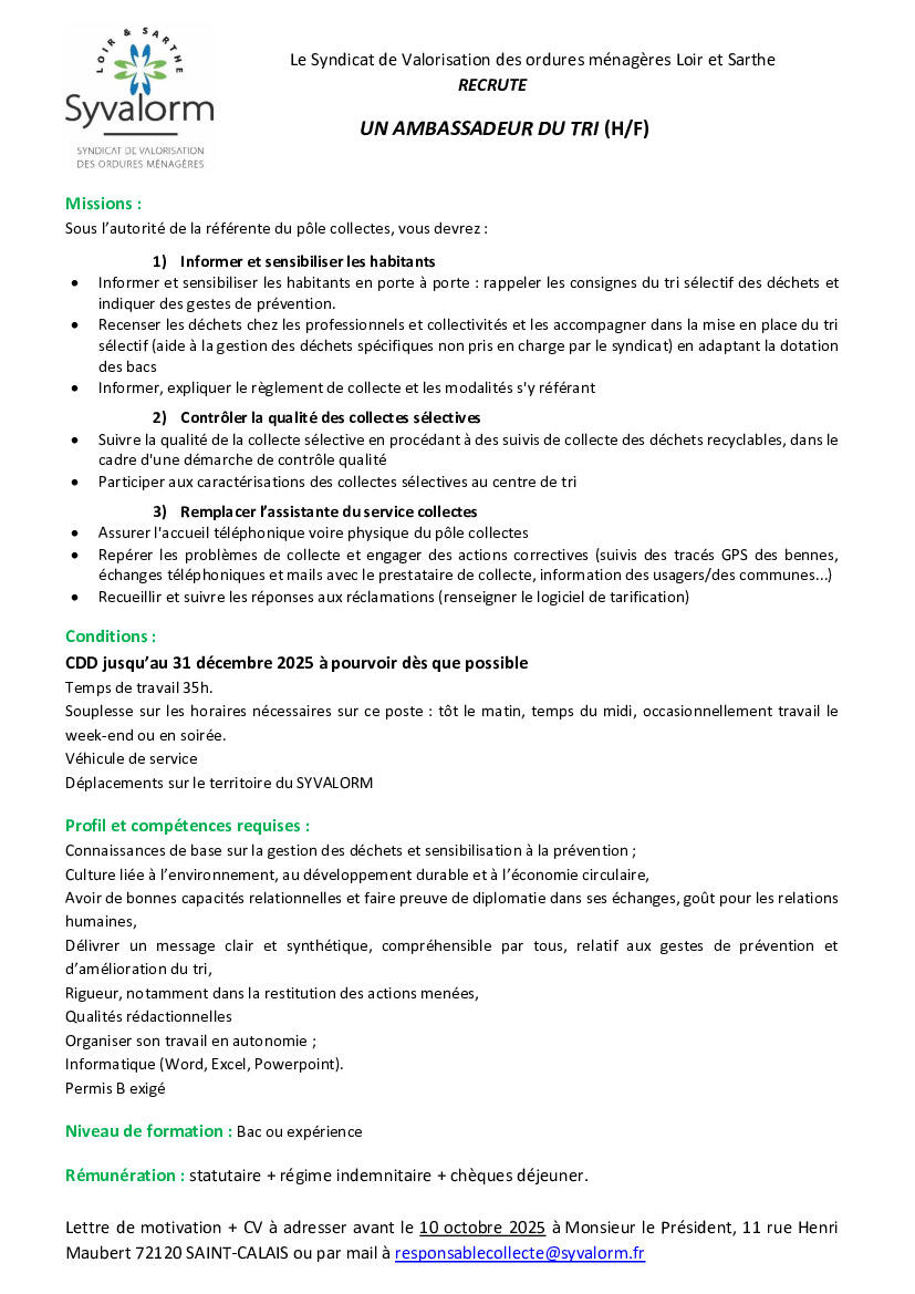 đŁ Le Syndicat de Valorisation des ordures mĂ©nagĂšres Loir et Sarthe RECRUTE :