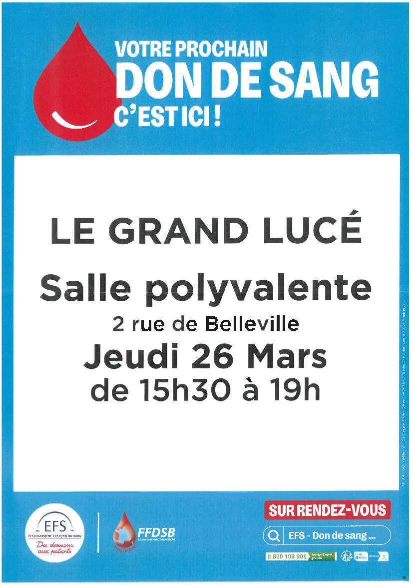 Don du Sang - Le Grand Lucé 20/03/2026 Le DON DU SANG a lieu Salle Polyvalente, 2 rue de Belleville le jeudi 26 mars de 15h30 à 19h