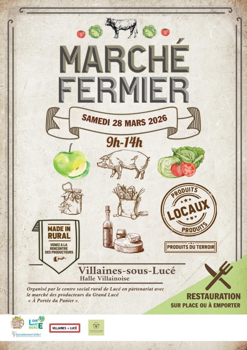 Marché Fermier le samedi 28 mars 2026 19/03/2026 Le marché fermier se tiendra le samedi 28 mars 2026 sous la Halle de Villaines sous Lucé.