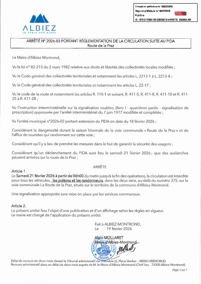 Veuillez trouver ci-joint l'arrêté n°2026-03 portant réglementation de la circulation suite au PIDA concernant la route de la PRAZ pour la journée du samedi 21 février 2026.