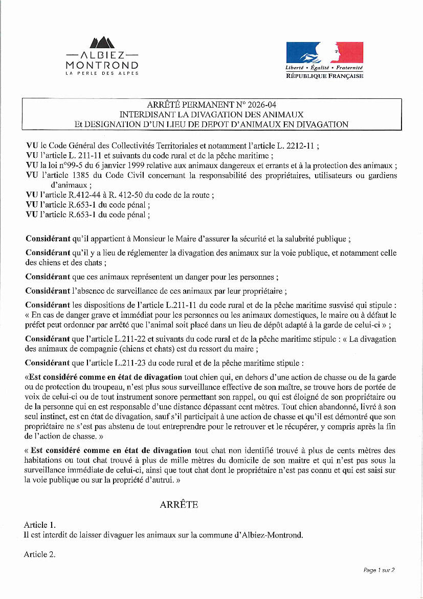 n° 2026-04 : interdisant la divagation des animaux et désignation d'un lieu de dépôt d'animaux en divagation