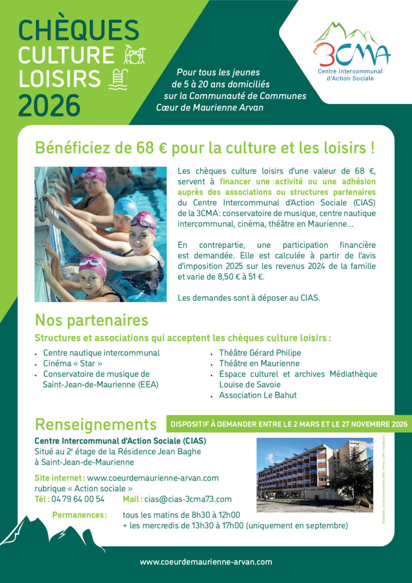 La Communauté de Communes Cœur de Maurienne Arvan (3CMA), via son Centre Intercommunal d’Action Sociale (CIAS), relance pour 2026 deux dispositifs phares destinés à favoriser l’accès des jeunes du territoire au sport, à la culture et aux loisirs.