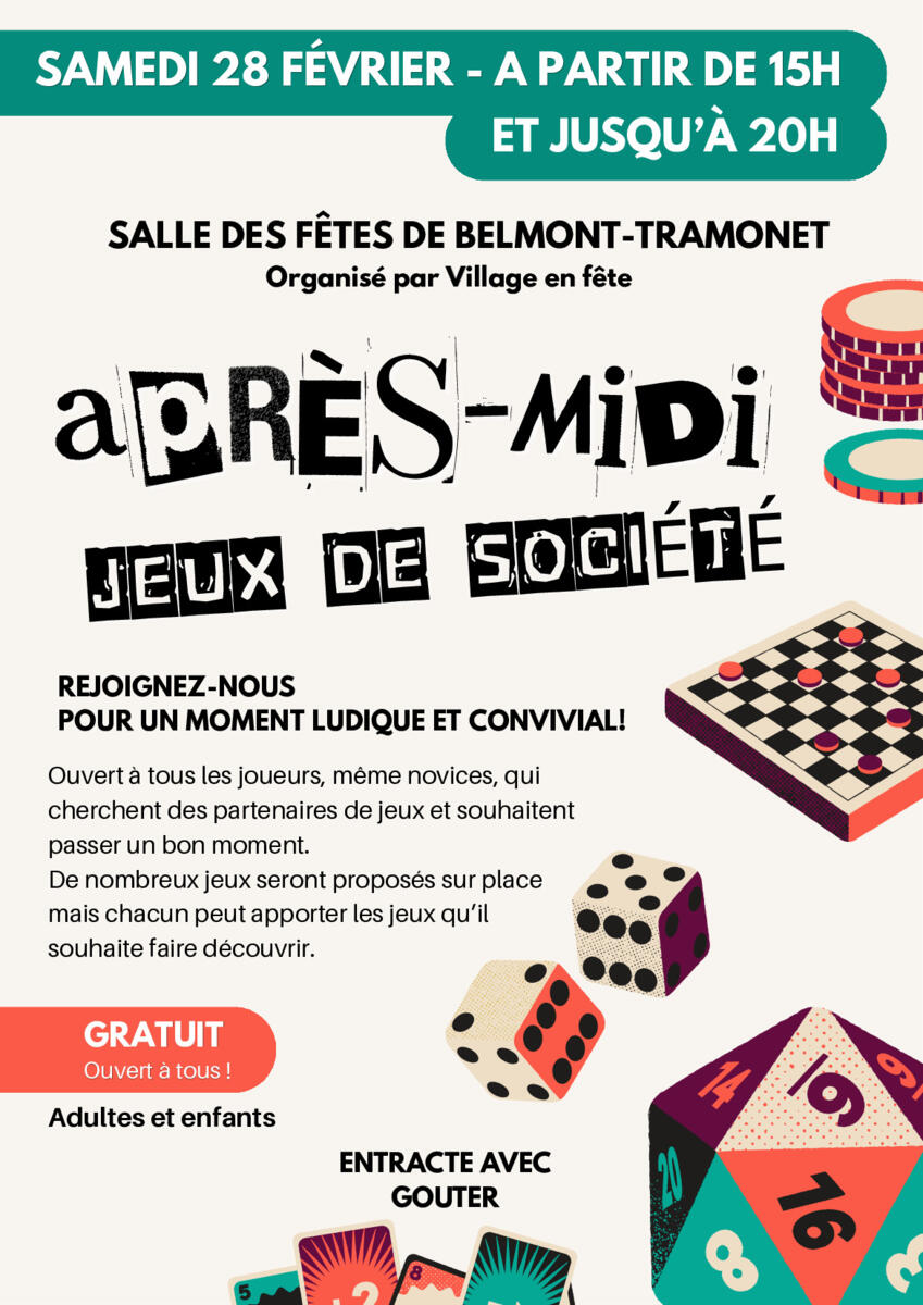 Apres-Midi Jeux De Societe Village En Fete 24/02/2026 Ce SAMEDI 28 FÉVRIER - à PARTIR de 15H à la SALLE DES FÊTES de BELMONT-TRAMONET Adultes et enfants REJOIGNEZ-NOUS POUR UN MOMENT LUDIQUE ET CONVIVIAL !
