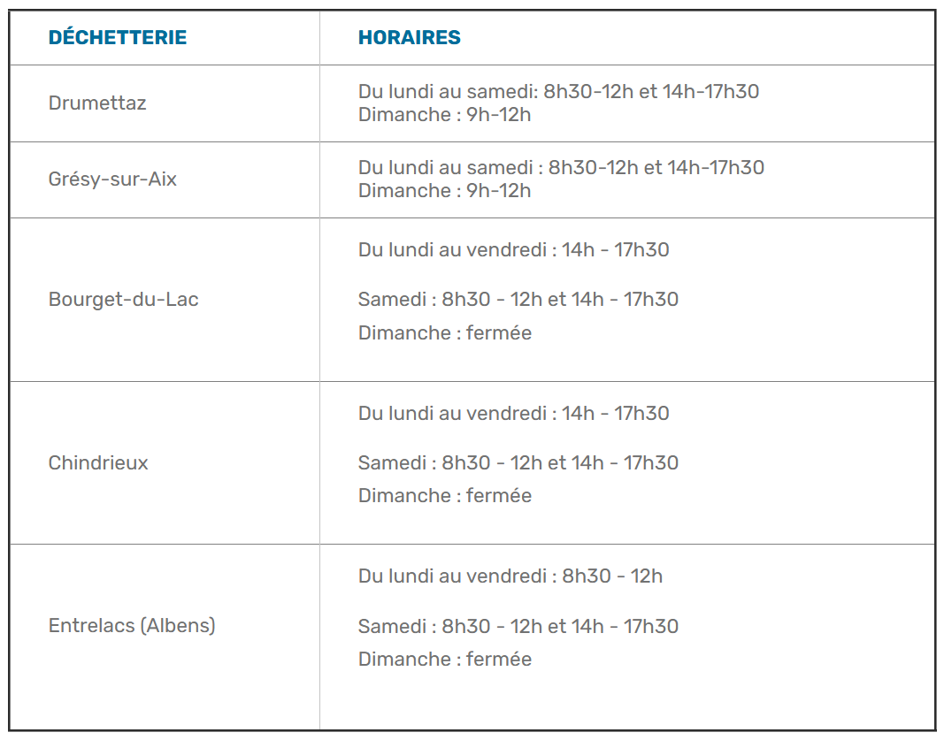 La déchetterie du Bourget-du-Lac est dorénavant ouverte du lundi au vendredi de 14h00 à 17h30 et le samedi de 8h30 à 12h00 et de 14h00 à 17h30.