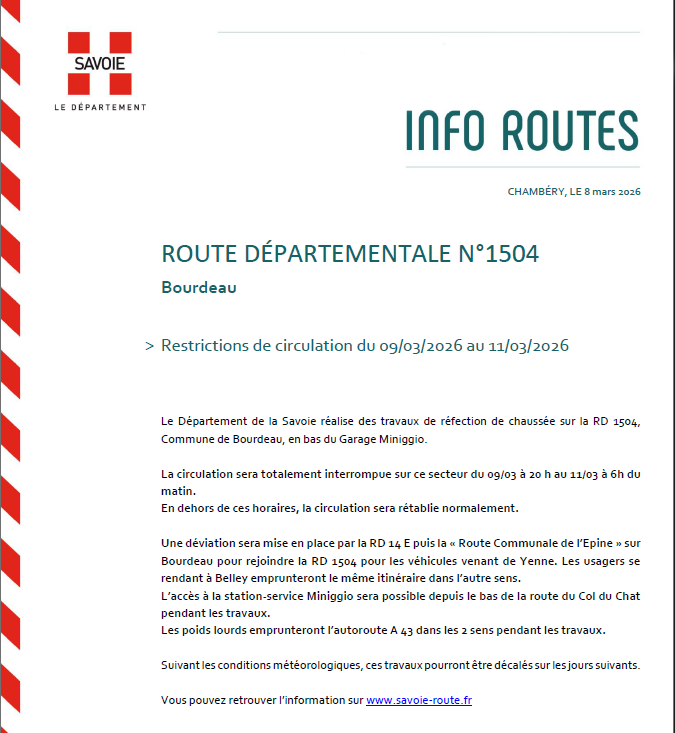 🔧 Pourquoi ? Réfection de la chaussée (reprise de l’enrobé et marquage routier) par le Département de la Savoie.