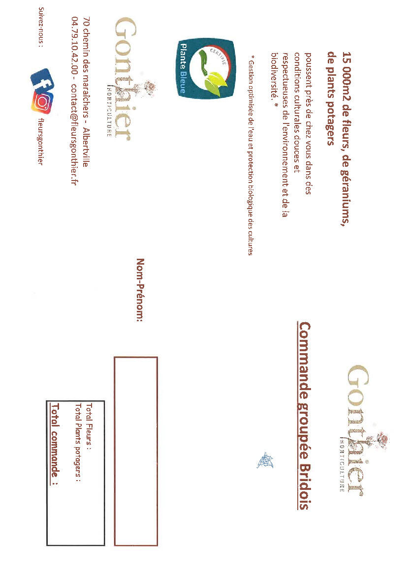 Cette année, Gonthier Horticulture qui est notre fournisseur de plantes depuis de nombreuses années, reconduit son opération en proposant aux bridois une sélection de fleurs et plants potagers à un tarif professionnel. Vous trouverez joint à ce présent mail la teneur de cette proposition (tarifs TTC).
