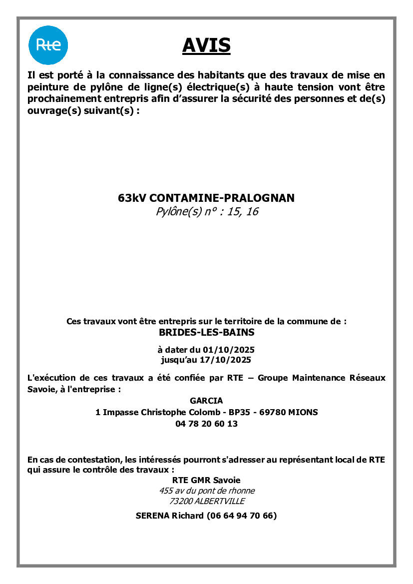 Il est porté à la connaissance des habitants que des travaux de mise en peinture de pylône de ligne(s) électrique(s) à haute tension vont être