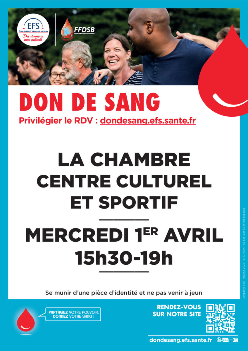 Une collecte de sang est organisée le mercredi 1er avril à La Chambre de 15h30 à 19h au Centre culturel et sportif.
