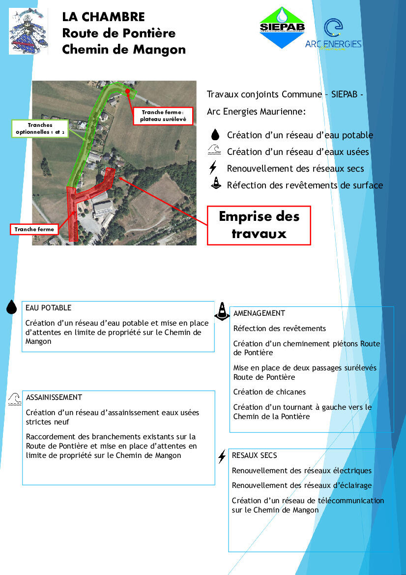 Les travaux conjoints Commune / SIEPAB / Arc Energies Maurienne prévus route de la Pontière et chemin de Mangon débuteront le 16 mars 2026.
