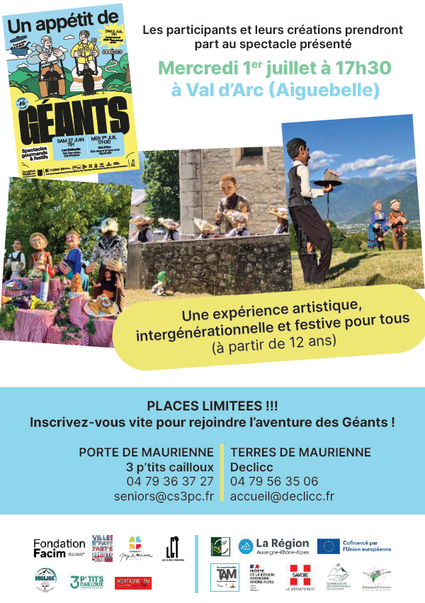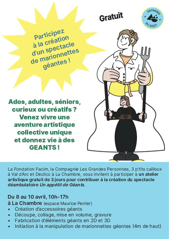 La Fondation Facim, la Compagnie Les Grandes Personnes, l’association 3 p’tits cailloux à Val d’Arc et Declicc à Saint Etienne de Cuines vous invitent à participer à un atelier artistique gratuit de 3 jours pour contribuer à la création du spectacle déambulatoire Un appétit de Géants.