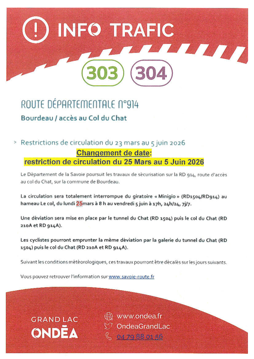 Grand Lac Vous Informe: Déviation Lignes Cars 25/03/2026 Suite aux travaux entre la RD1504 et la RD914 les lignes 303 et 304 seront perturbées le temps des travaux.