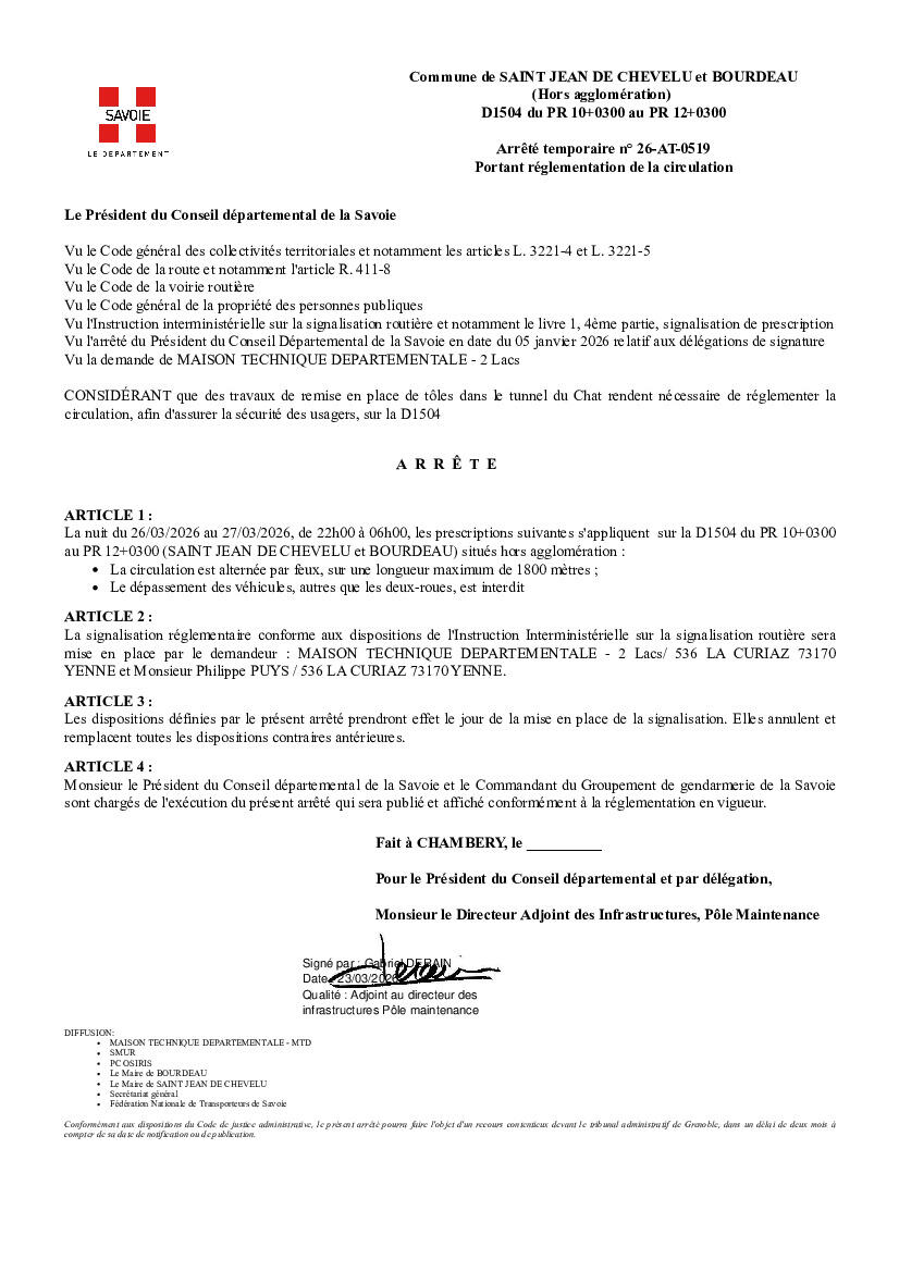 La Mairie Vous Informe "Tunnel Du Chat" 26/03/2026 REGLEMENTATION DE LA CIRCULATION TUNNEL DU CHAT En raison de travaux la circulations des véhicules sera alternée par feux : Du 26/03/2026 au 27/03/2026 de 22h00 à 6h00