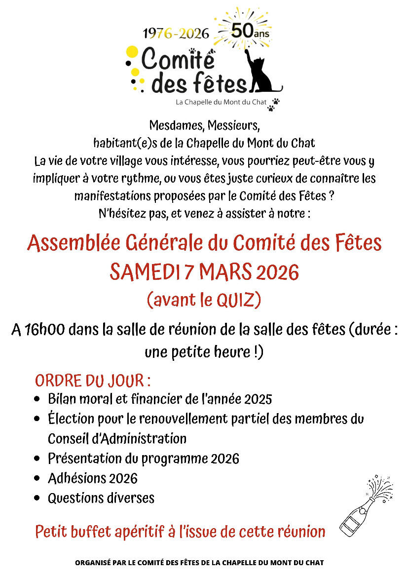 Nous vous rappelons l'Assemblée Générale du Comité des Fêtes ce samedi 7 mars à 16h00.