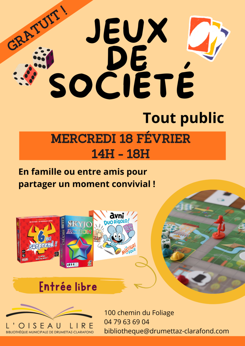 🎲 La Bibliothèque vous invite à une après-midi jeux de société le mercredi 18 février de 14h à 18h !
