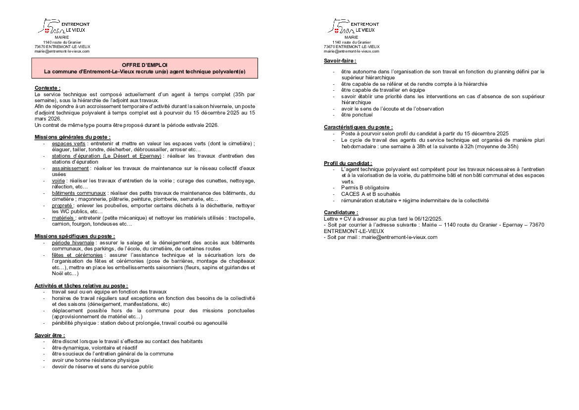 OFFRE D'EMPLOI - ADJOINT TECHNIQUE
