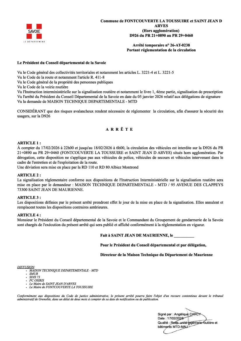 Arrêté - Circulation interdite sur le D926 22h00 - 6h00