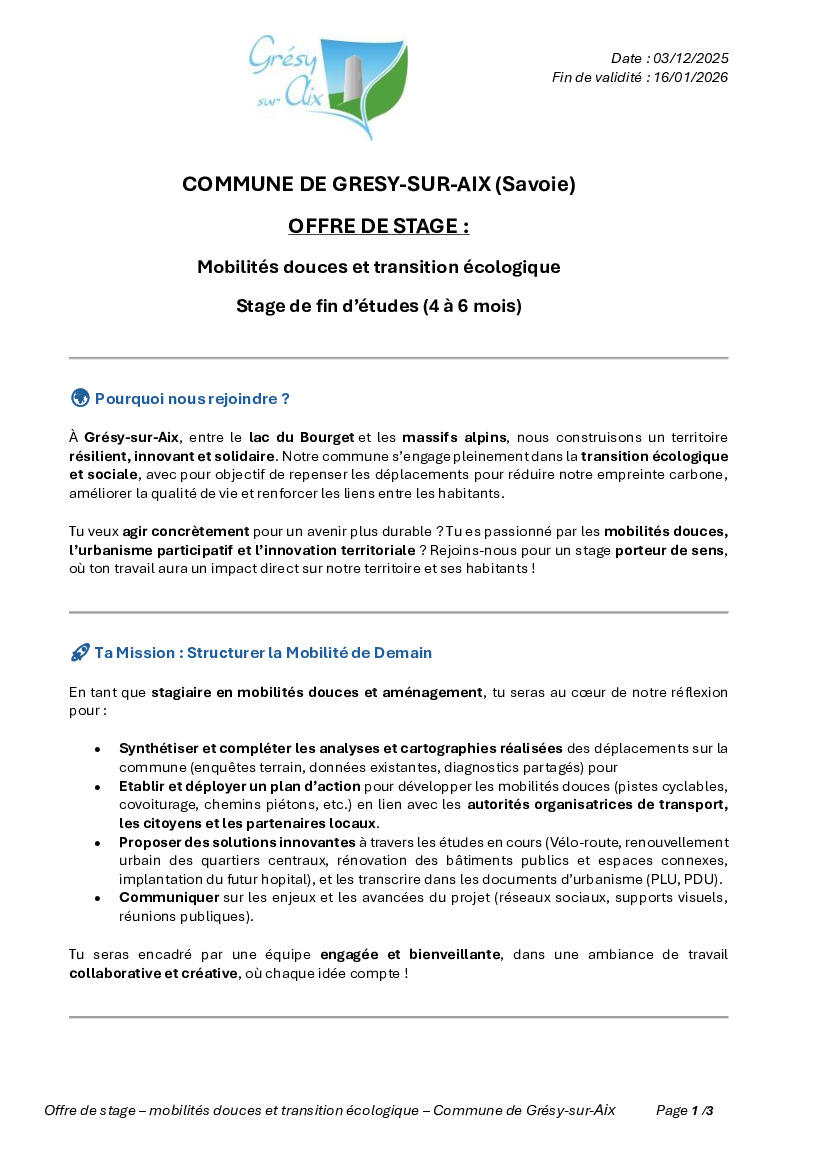 🔎 La Commune de Grésy-sur-Aix recherche son/sa stagiaire en mobilités douces et aménagement !