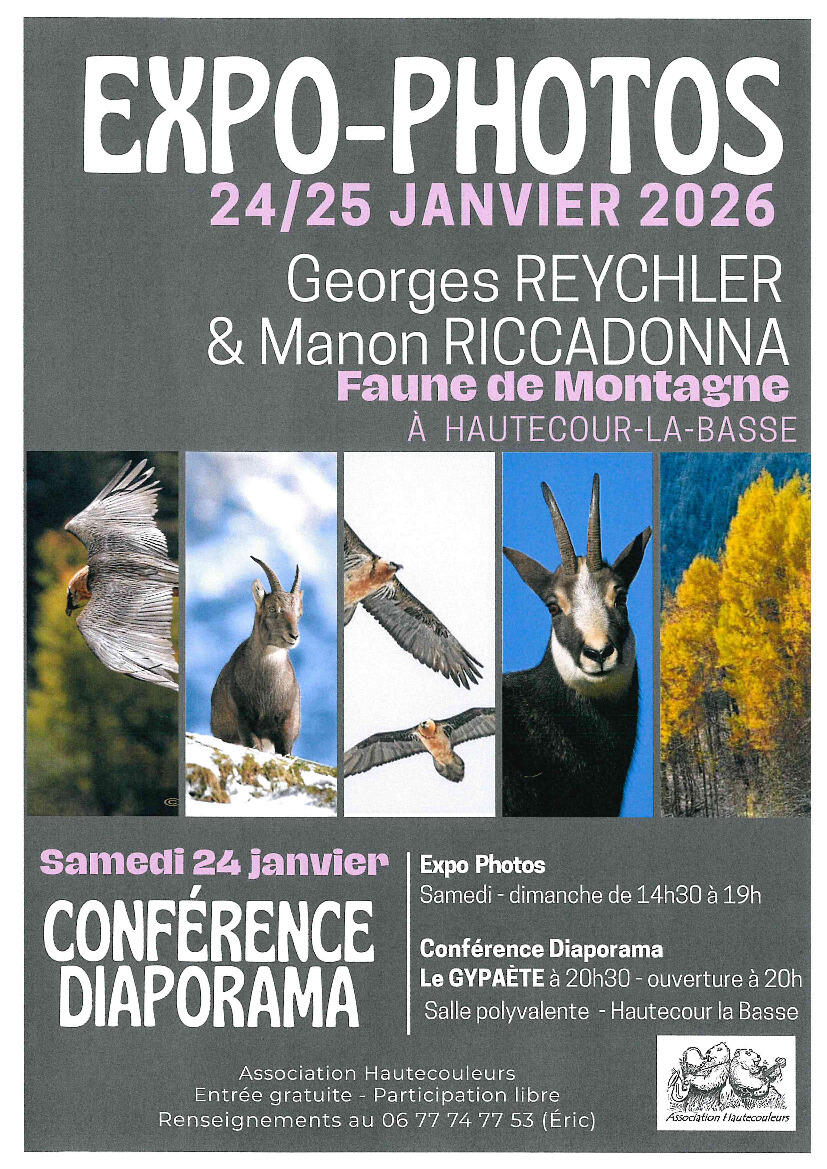 Les photos de Georges REYCHLER et de Manon RICCADONNA sur la faune de montagne, seront également exposées à la salle polyvalente samedi / dimanche 24 et 25 janvier de 14h30 à 19h00.