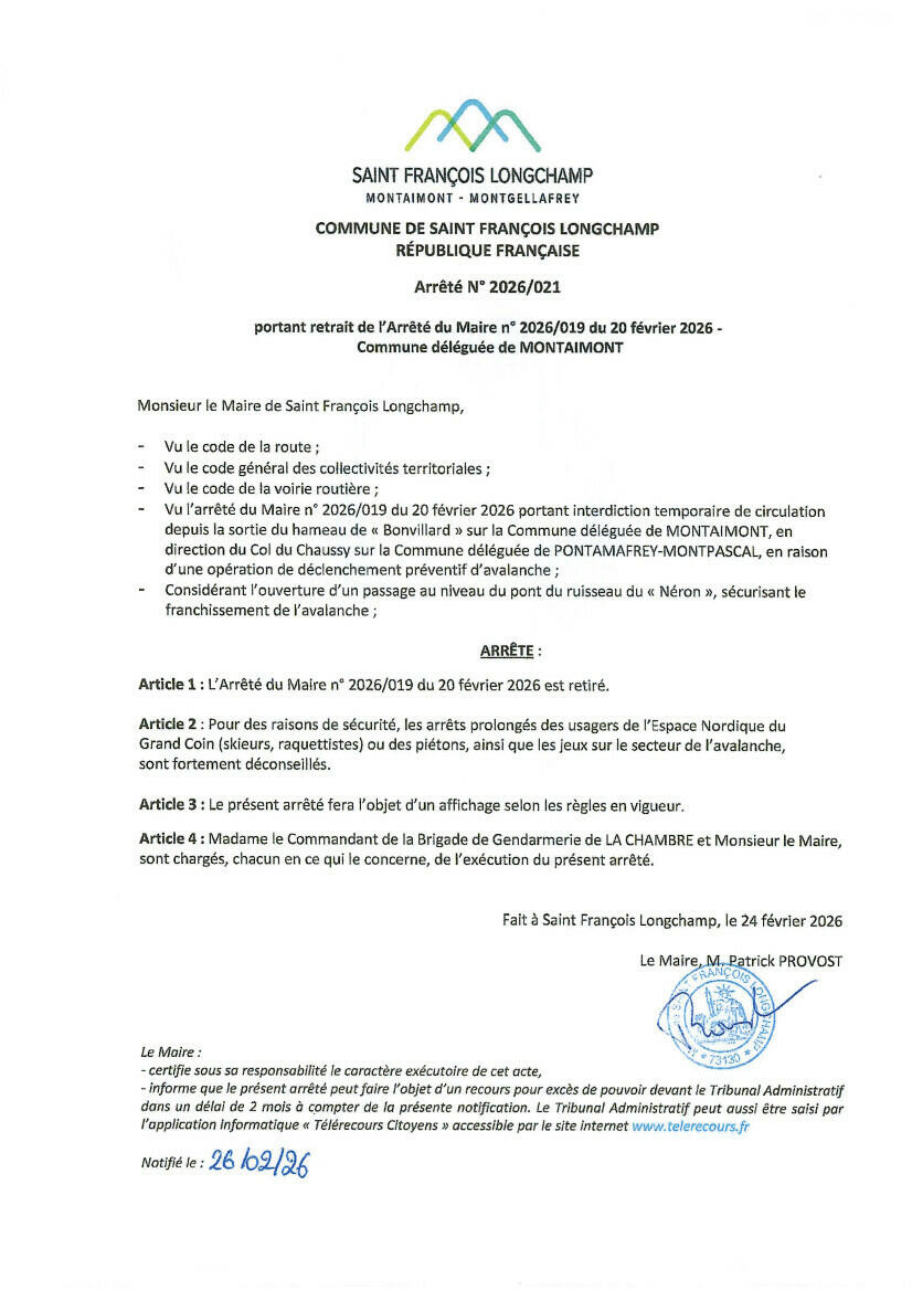 Arrêté zone nordique du Grand Coin 26/02/2026 Arrêté du maire de St François Longchamp concernant la zone nordique du Grand Coin