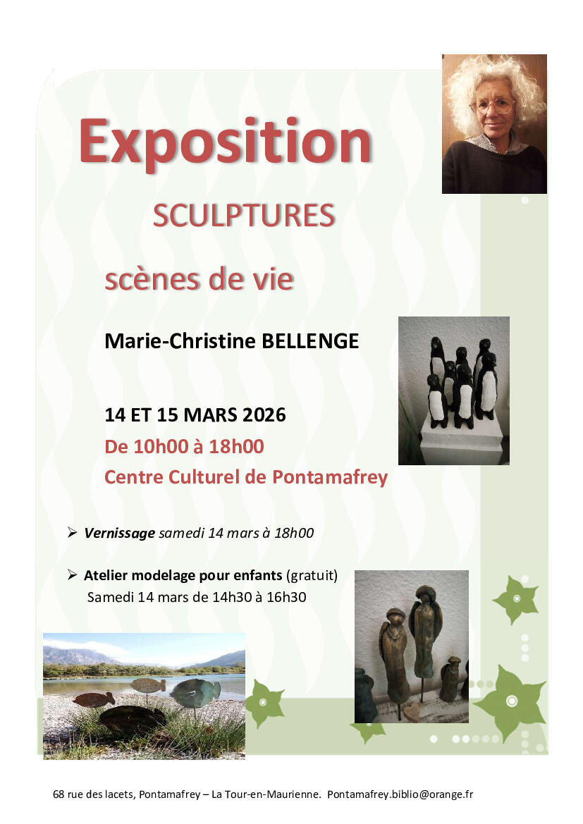 Exposition de sculptures 26/02/2026 Exposition de sculptures le 14 et 15 mars 2026 de 10h00 à 18h00 au centre culturel de Pontamafrey