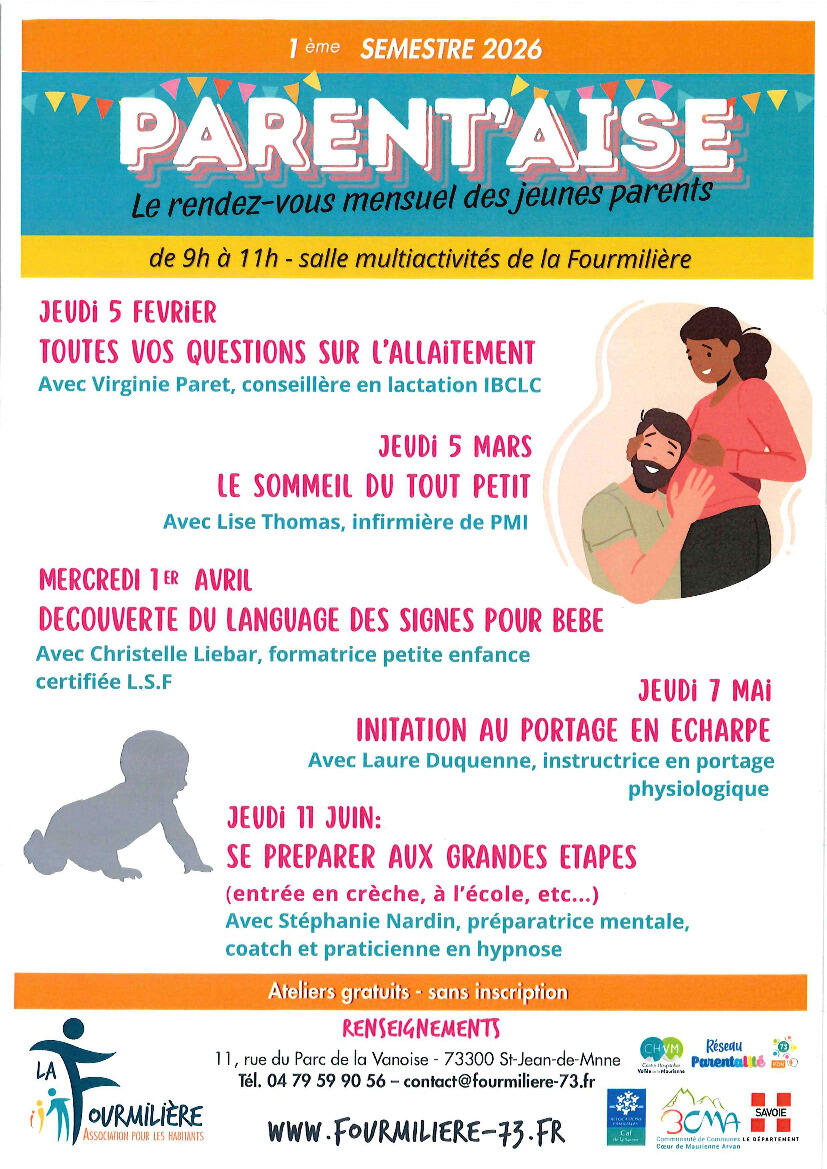 PARENT'AISE 23/01/2026 "Le rendez-vous mensuel des jeunes parents" de 9h à 11 h, salle multi activités de la Fourmilière