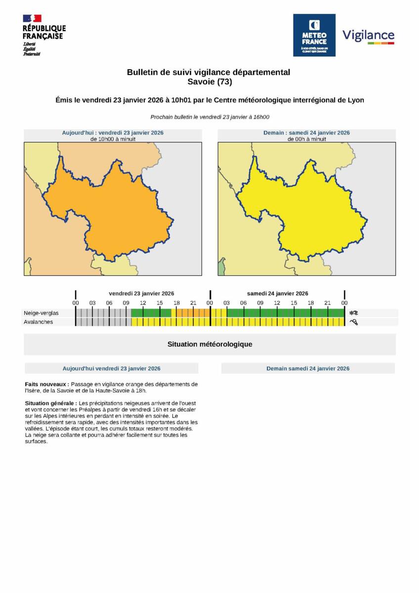 La préfecture de la Savoie vous informe que  Météo-France place la Savoie en vigilance orange neige-verglas ce vendredi 23 janvier à partir de 18 heures.