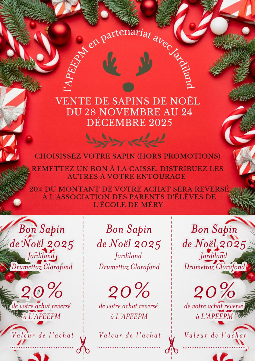 🎄 L’APEEPM organise une vente de sapins de Noël en partenariat avec Jardiland jusqu'au 24 décembre.