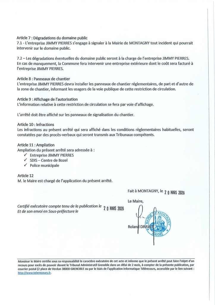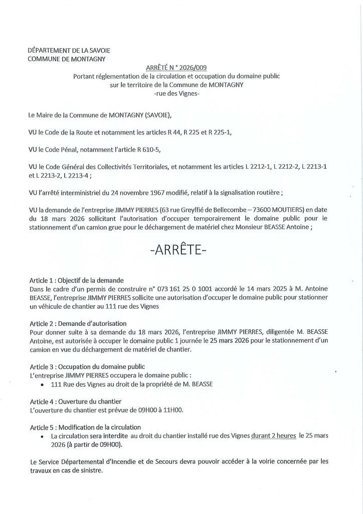 L'entreprise JIMMY PIERRES est autorisée a occuper le domaine public une journée pour le stationnement de véhicules et matériel de chantier. Arrêté municipal 2026/009