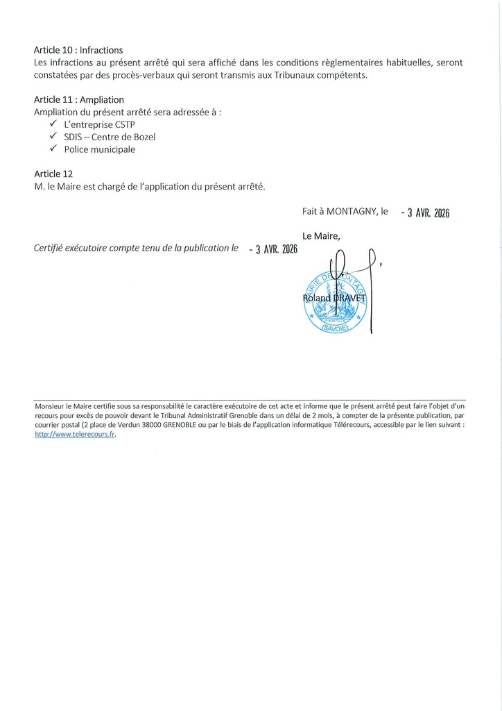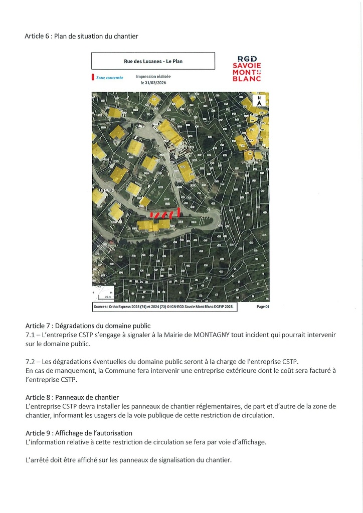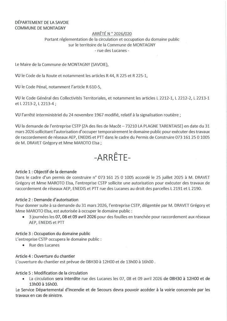 L'entreprise CSTP est autorisée a occuper le domaine public pour des travaux de raccordement réseaux AEP, ENEDIS et PTT.