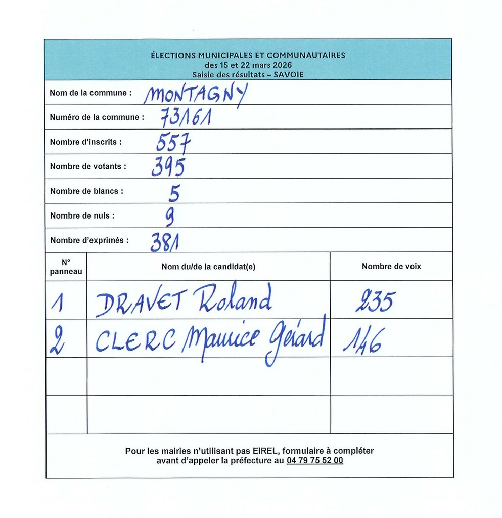Résultats des élections municipales du 15/03/2026 16/03/2026 12 sièges sont donc attribués à la liste de Roland DRAVET et 3 sièges à la liste de Maurice Gérard CLERC