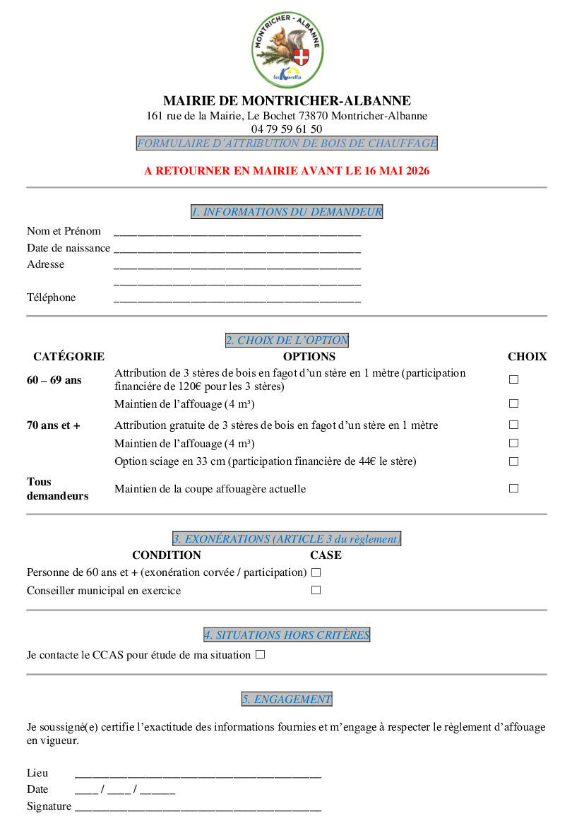 • Les foyers dont le demandeur est âgé de 60 à 69 ans peuvent bénéficier de 3 stères de bois dur, moyennant une participation financière fixée annuellement par le Conseil municipal.