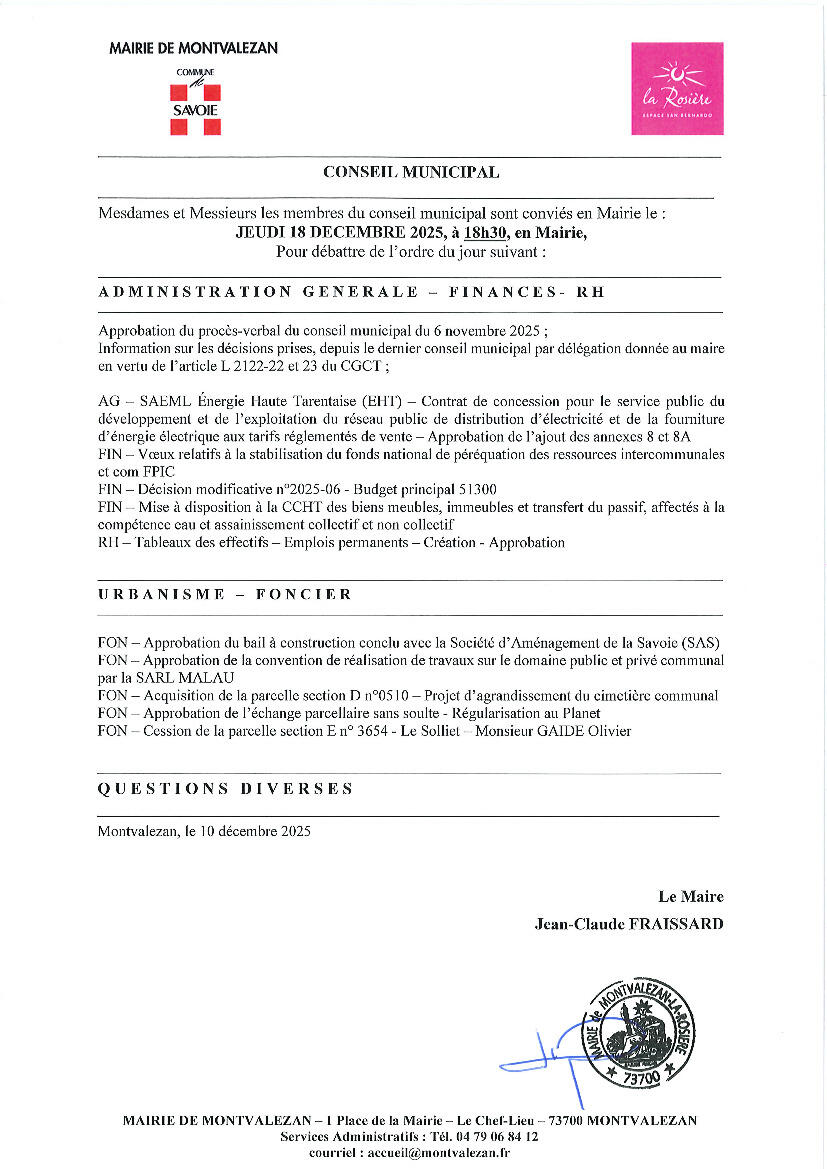 Conseil Municipal du 18 décembre 2025 - l'ORDRE DU JOUR 🖋