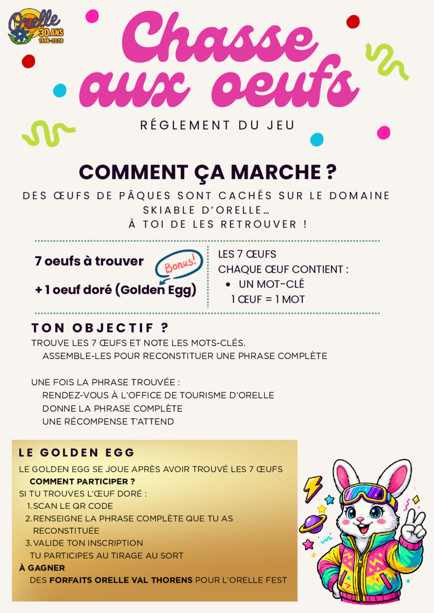 Partez à la recherche des œufs cachés sur le domaine skiable d’Orelle et tentez de reconstituer une phrase pour gagner des chocolats… et peut-être remporter le Golden Egg !