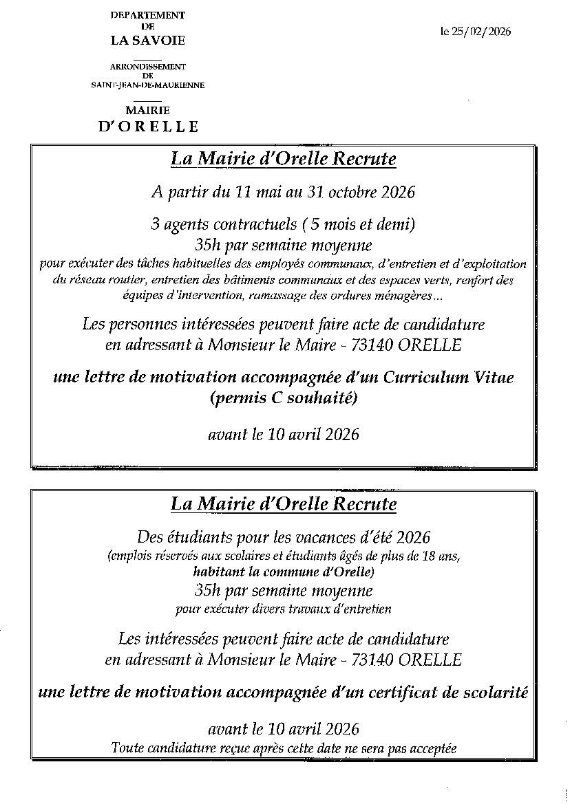 La commune d'Orelle recherche du personnel pour la saison d'été.