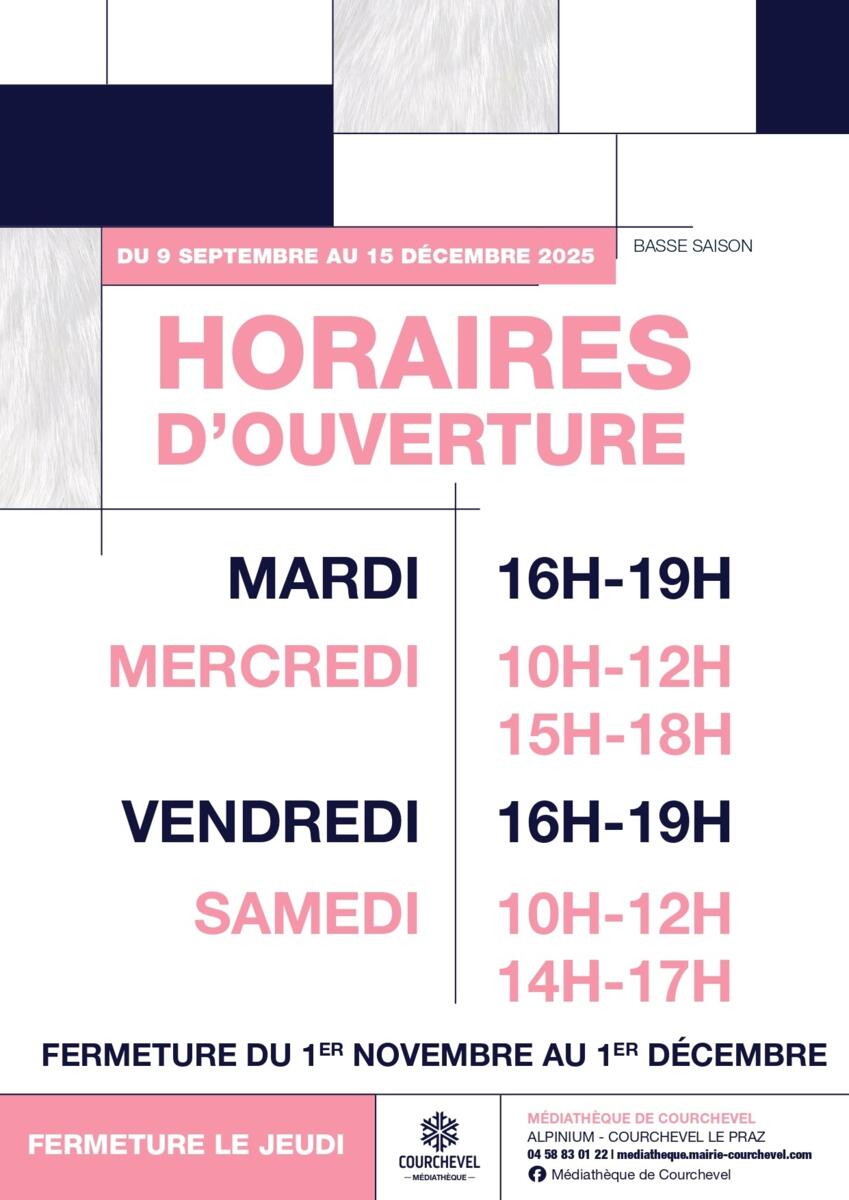 MEDIATHEQUE : HORAIRES BASSE SAISON du 9 septembre au 15 déc
