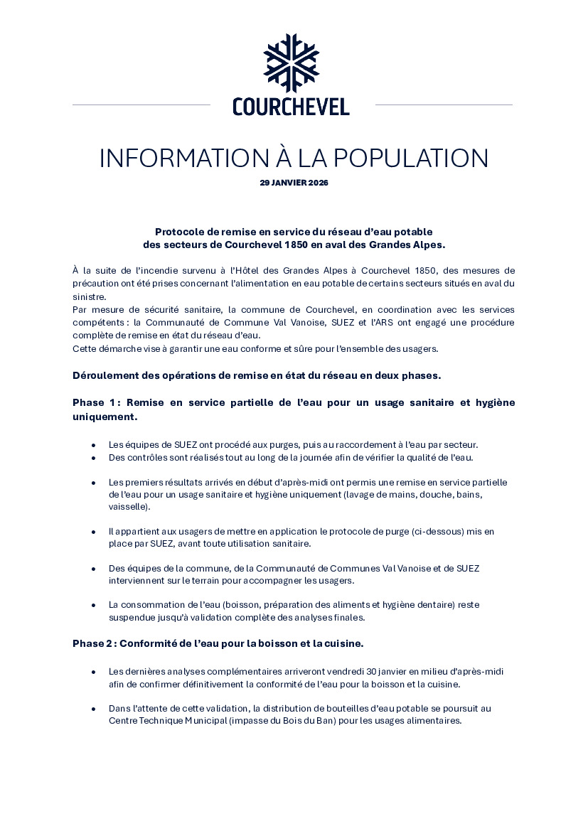 Pour les secteurs concernés à Courchevel 1850 et en aval des Grandes Alpes, merci de bien vouloir prendre connaissance du protocole de remise en service du réseau d'eau.