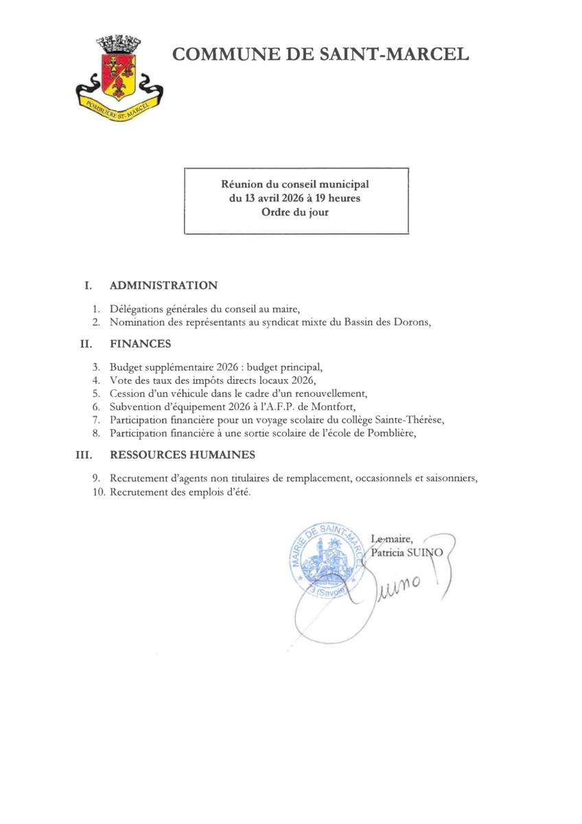 Conseil municipal le lundi 13 avril 2026 à 19 heures