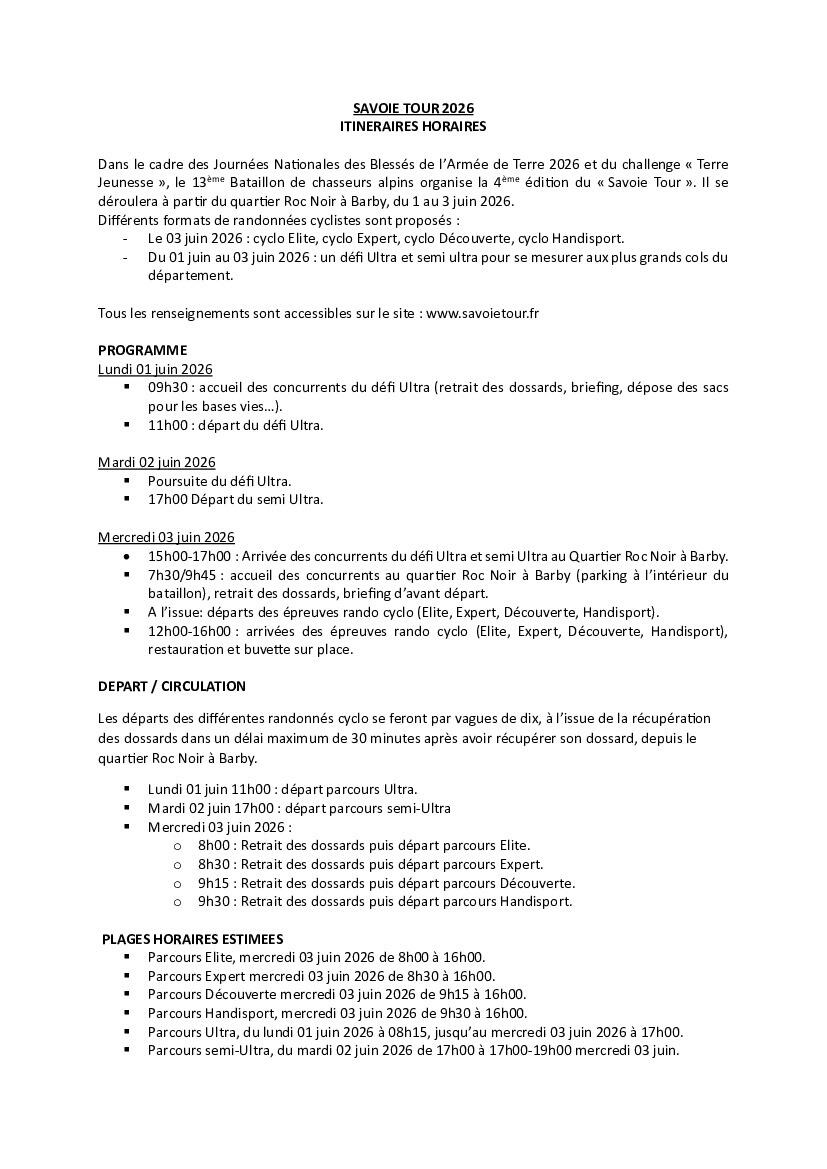 Le club sportif et artistique du 13e Bataillon de chasseurs alpins organise la quatrième édition du SAVOIE TOUR du 1er au 3 juin 2026. Cet événement sportif et solidaire vise à récolter des fonds pour les blessés de guerre. L’objectif de cette édition est de renforcer les liens qui unissent le bataillon à son environnement, et en particulier ceux avec la jeunesse.