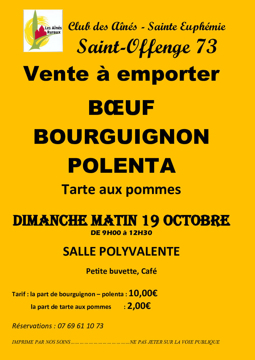 Dimanche matin 19 Octobre, parallèlement à l'exposition, aura lieu devant la salle polyvalente, une vente à emporter de bœuf bourguignon au profit des aînés du Club Sainte Euphémie.
