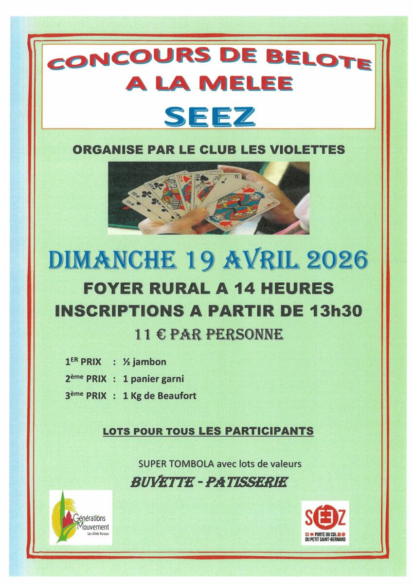 Concours de belote le 19 avril ♣️♥️ 07/04/2026 Concours de belote avec le club des violettes le dimanche 19 avril au foyer rural