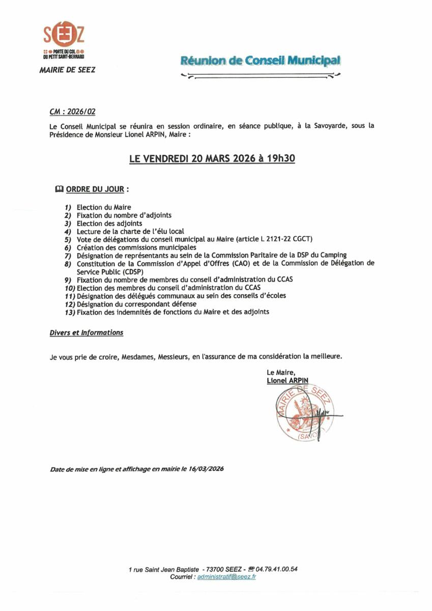 Conseil Municipal le 20/03 16/03/2026 📌 Réunion du Conseil Municipal le vendredi 20 mars à 19h30 à la salle de la Savoyarde