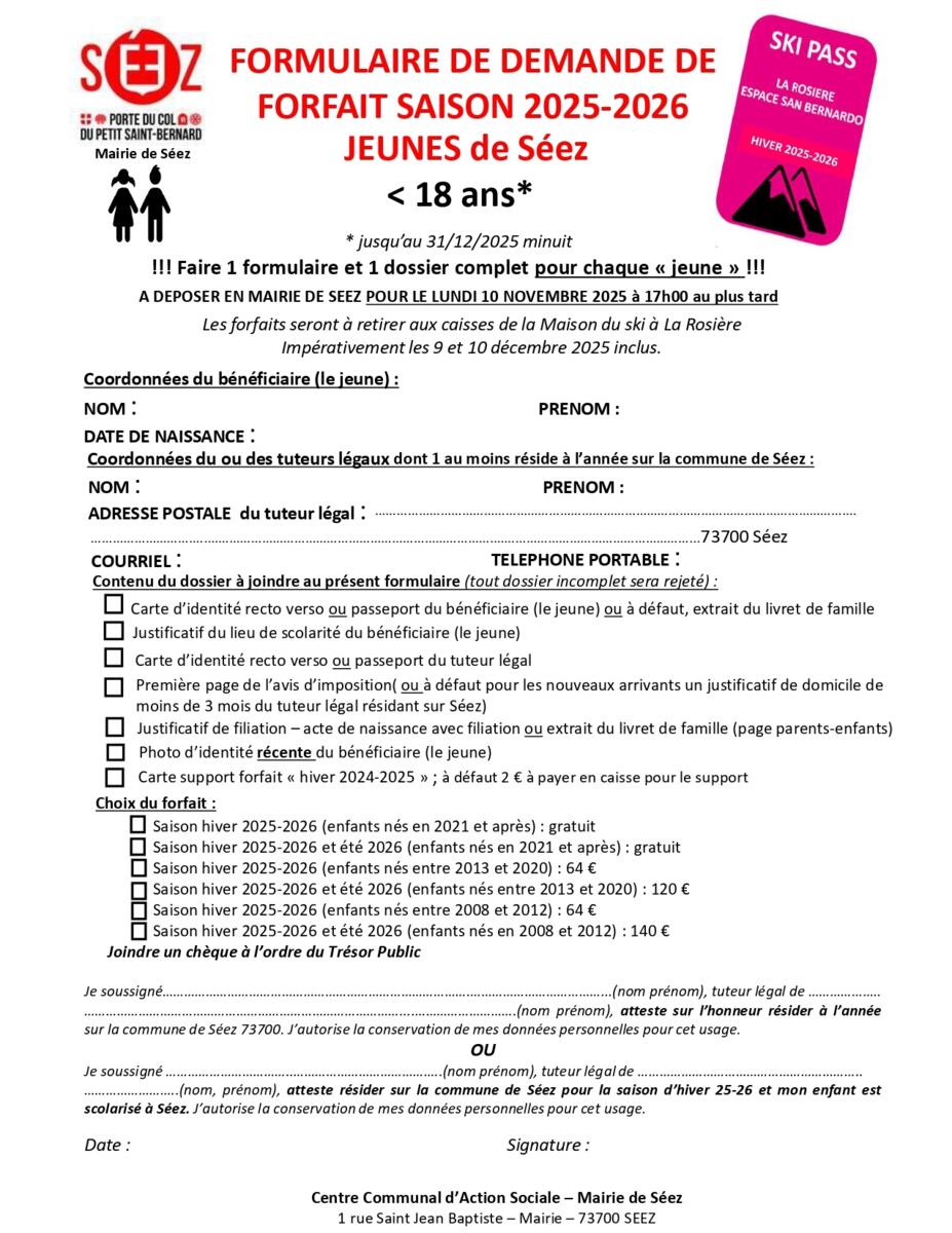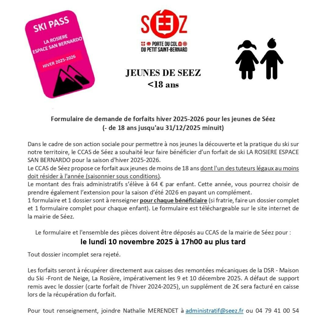 👉 Information forfait de ski à tarif préférentiel pour les jeunes de Séez (moins de 18 ans) ⛷