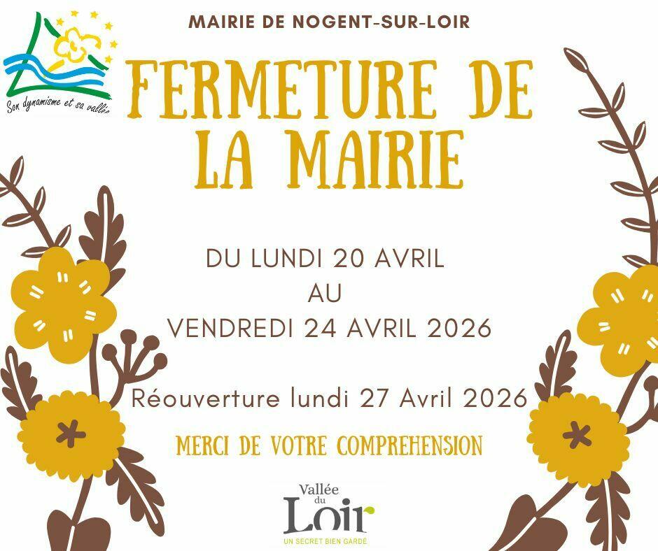 Fermeture De La Mairie 13/04/2026 Bonjour à tous, La mairie sera fermée du Lundi 20 au Vendredi 24 Avril 2026. Merci de votre compréhension.
