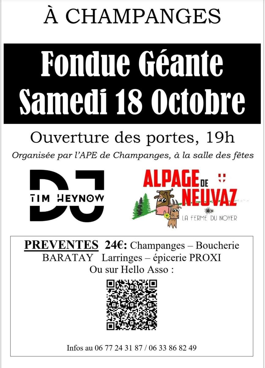 L'APE de Champanges propose la fondue géante le samedi 18 octobre 2025 à la salle des fêtes.