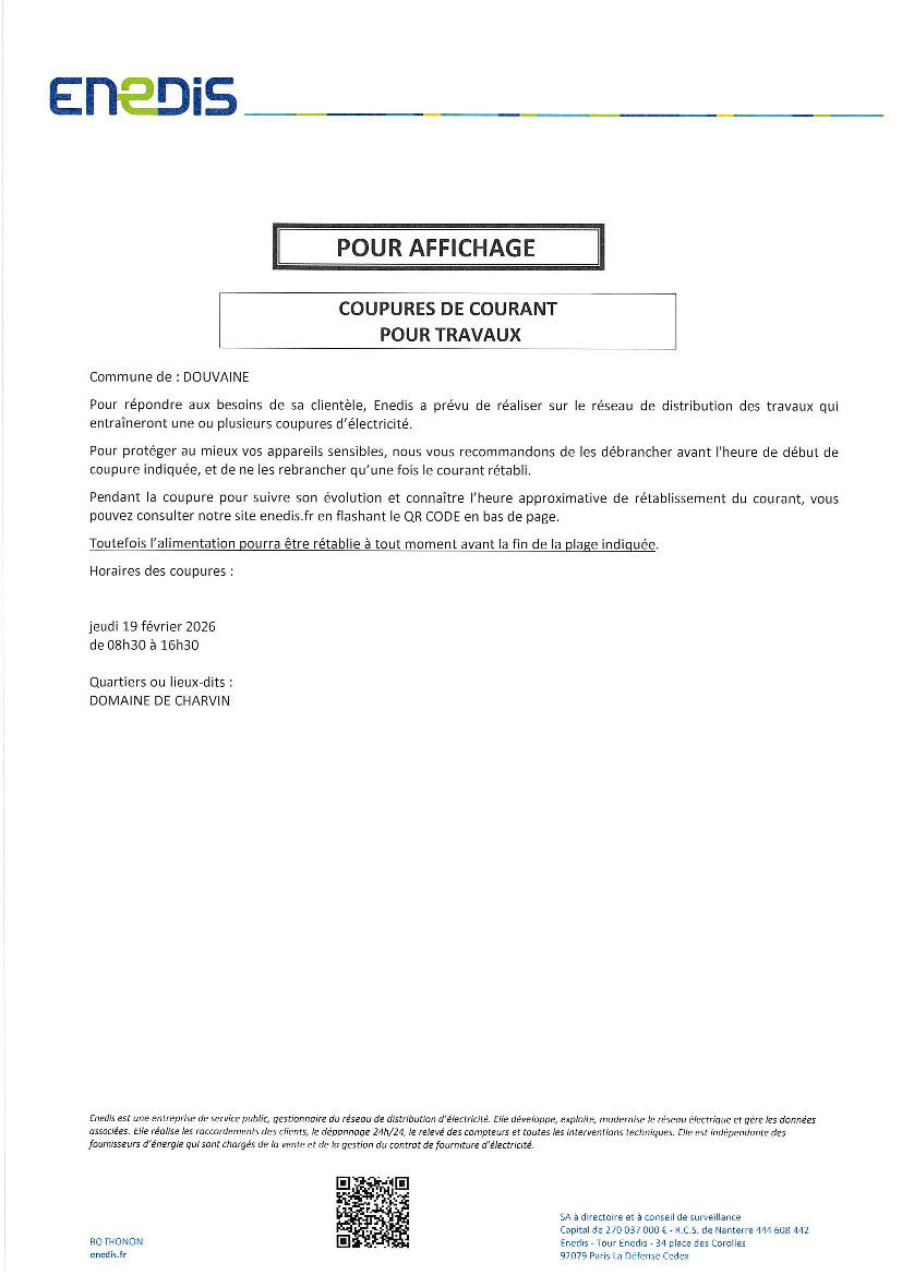Avis de coupures de courant pour travaux le jeudi 19 février 2026 au Domaine de Charvin de 8h30 à 16h30.