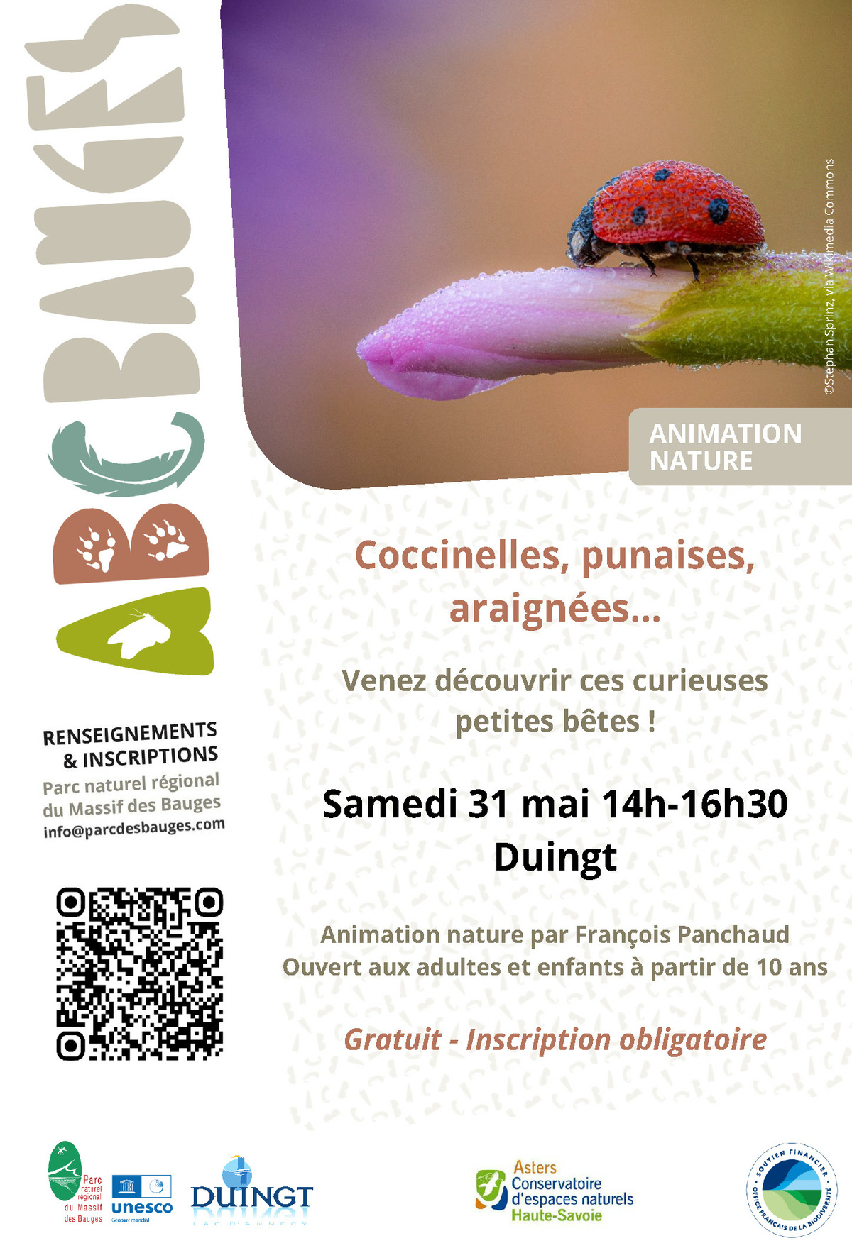 Dans le cadre des Atlas de la Biodiversité Communale et accompagnés par François Panchaud, animateur nature, venez découvrir ces coccinelles, punaises, araignées, ou encore opilions, qui vivent tout autour de vous et parfois même s'invitent dans votre habitation.