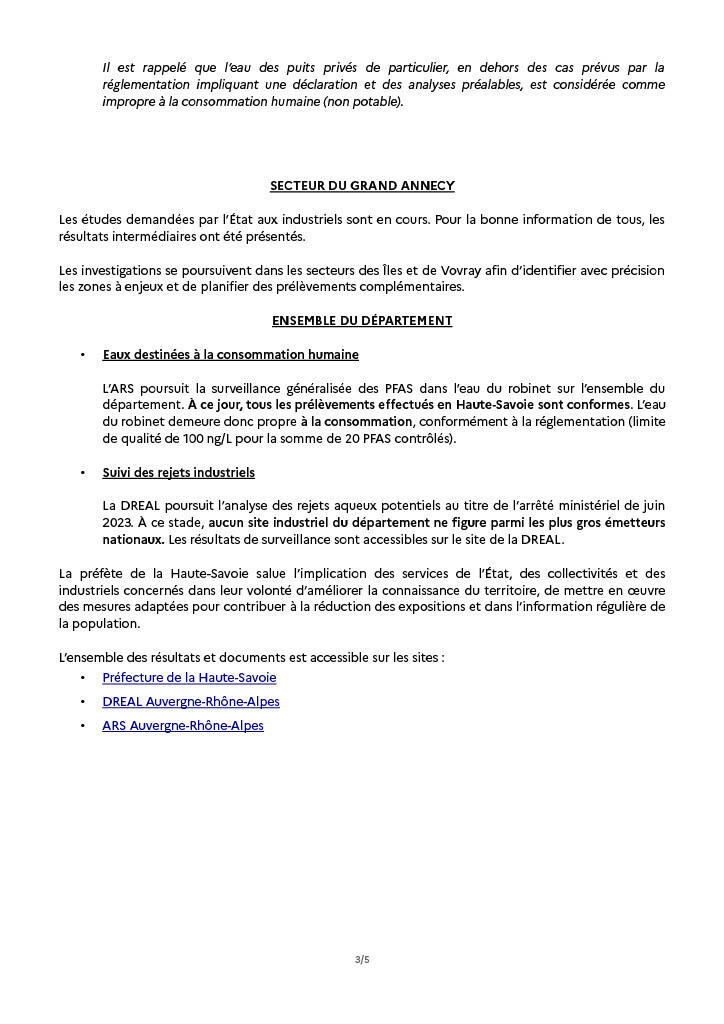 Présence de perfluorés (PFAS) – Point d’étape et recommandations actualisées en provenance de la Préfecture de Haute-Savoie.