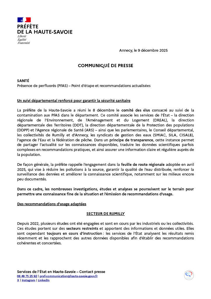 La préfète de la Haute-Savoie a réuni le 8 décembre le comité des élus consacré au suivi de la contamination aux PFAS dans le département. Ce comité associe les services de l’État – la direction régionale de l’Environnement, de l’Aménagement et du Logement (DREAL), la direction départementale des Territoires (DDT), la direction départementale de la Protection des populations (DDPP) et l’Agence régionale de Santé (ARS) – ainsi que les parlementaires, le Conseil départemental, les collectivités de Rumilly et d’Annecy, les syndicats de gestion des eaux (SMIAC, SILA, CISALB), l’agence de l’Eau et la fédération de pêche. Dans un principe de transparence, cette instance permet de partager l’actualité sur les connaissances disponibles, traduire les données scientifiques parfois complexes en recommandations pratiques, et ainsi assurer une information claire et régulière auprès de la population.