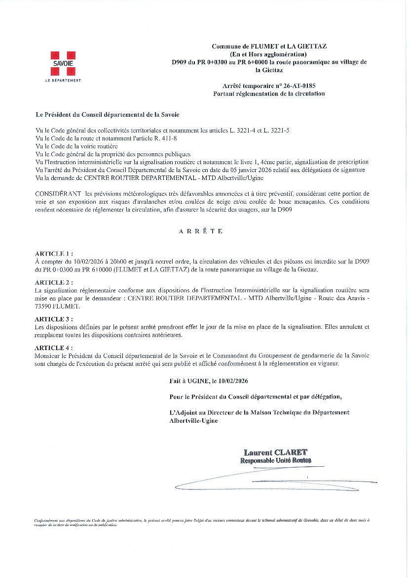 FERMETURE DE LA ROUTE ENTRE FLUMET et LA GIETTAZ - D909