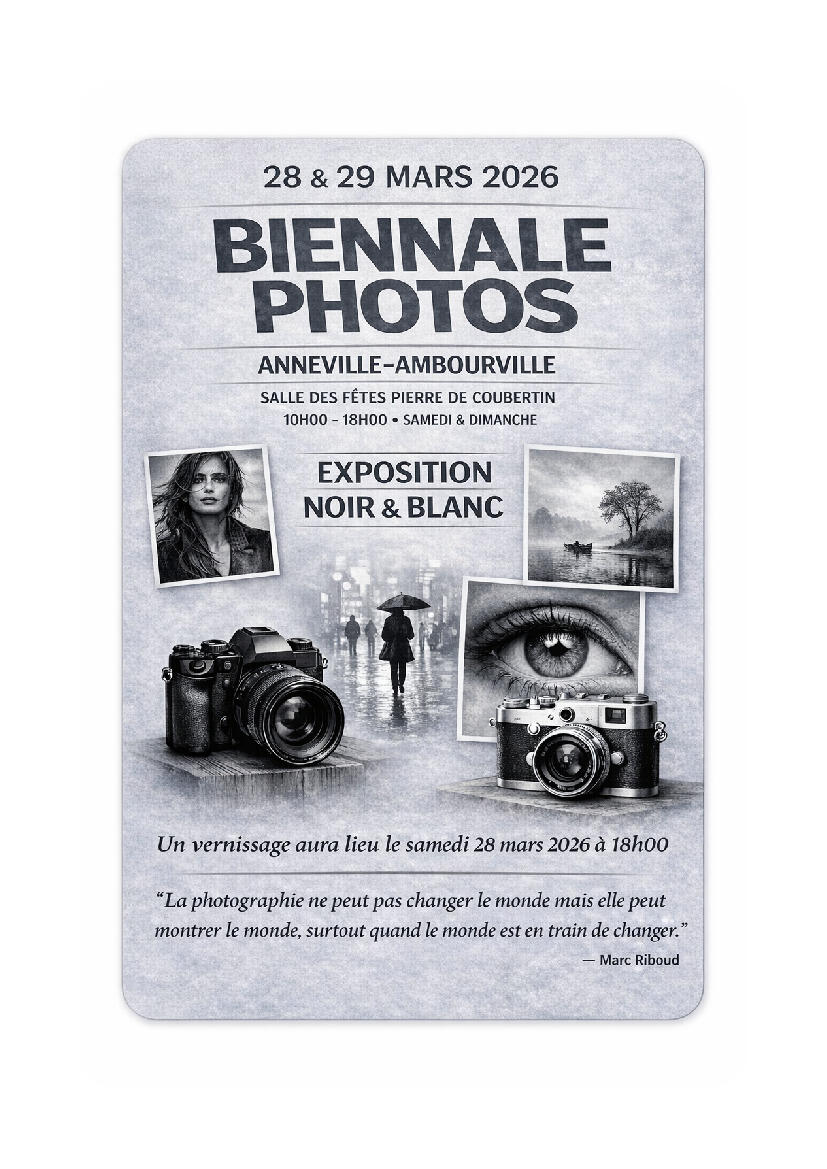 Biennale photos 2026 - 28 et 29 mars 2026 17/02/2026 Notez ce rendez-vous important pour notre commune. De nombreux talents et du rêve vous attendront 🤗